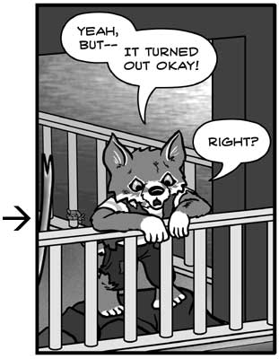 Riff recounts the facts from an earlier strip where Sandy throws the power cells out the window.  In the third panel, Riff acts surprised to see the clock.  How could he forget holding the clock between his feet from Strip #114, him saving the clock before saving himself in Strip #115, or him telling Sandy about power cells being interchangeable in Strip #148?